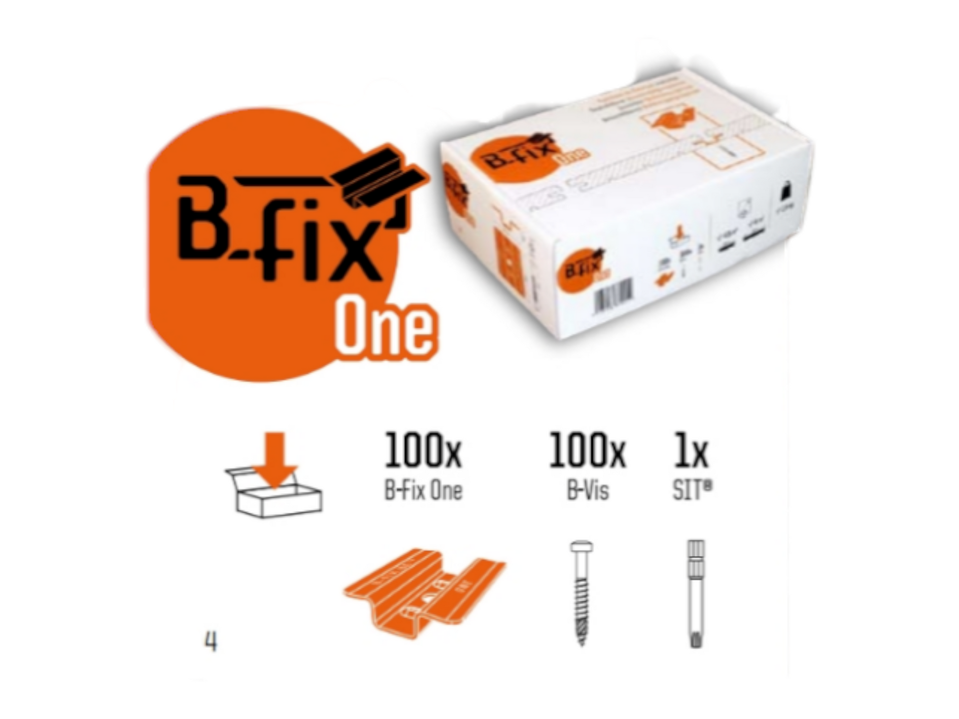 The B-Fix One is sold by the box (100 units). The box also includes 100 self-drilling screws, instructions, and a Torx bit.